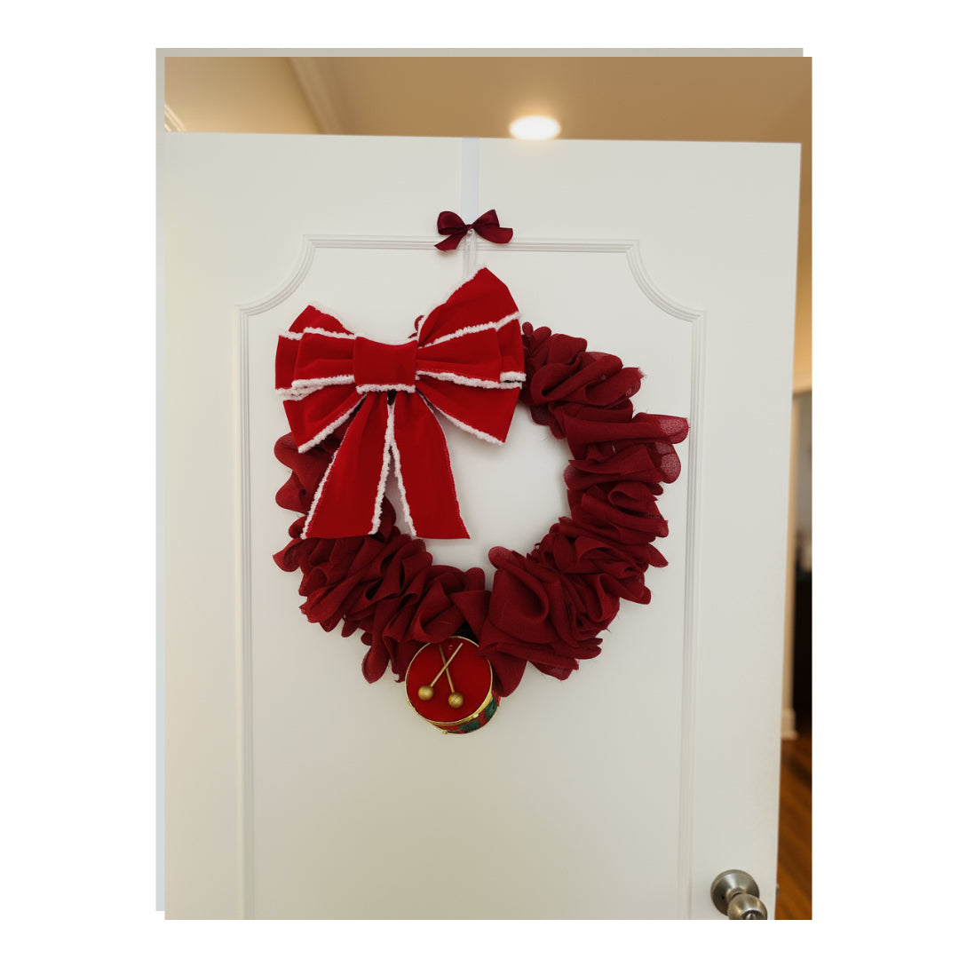 Porta il calore del Natale nella tua casa con questa elegante ghirlanda a forma di cuore. Realizzata in morbida stoffa rossa, presenta un grande fiocco decorativo con bordi bianchi e un dettaglio inferiore ispirato a un tamburo nataliziocon bacchette dorate. Perfetta da appendere alla porta o al muro, aggiunge un tocco accogliente e festoso a qualsiasi ambiente.