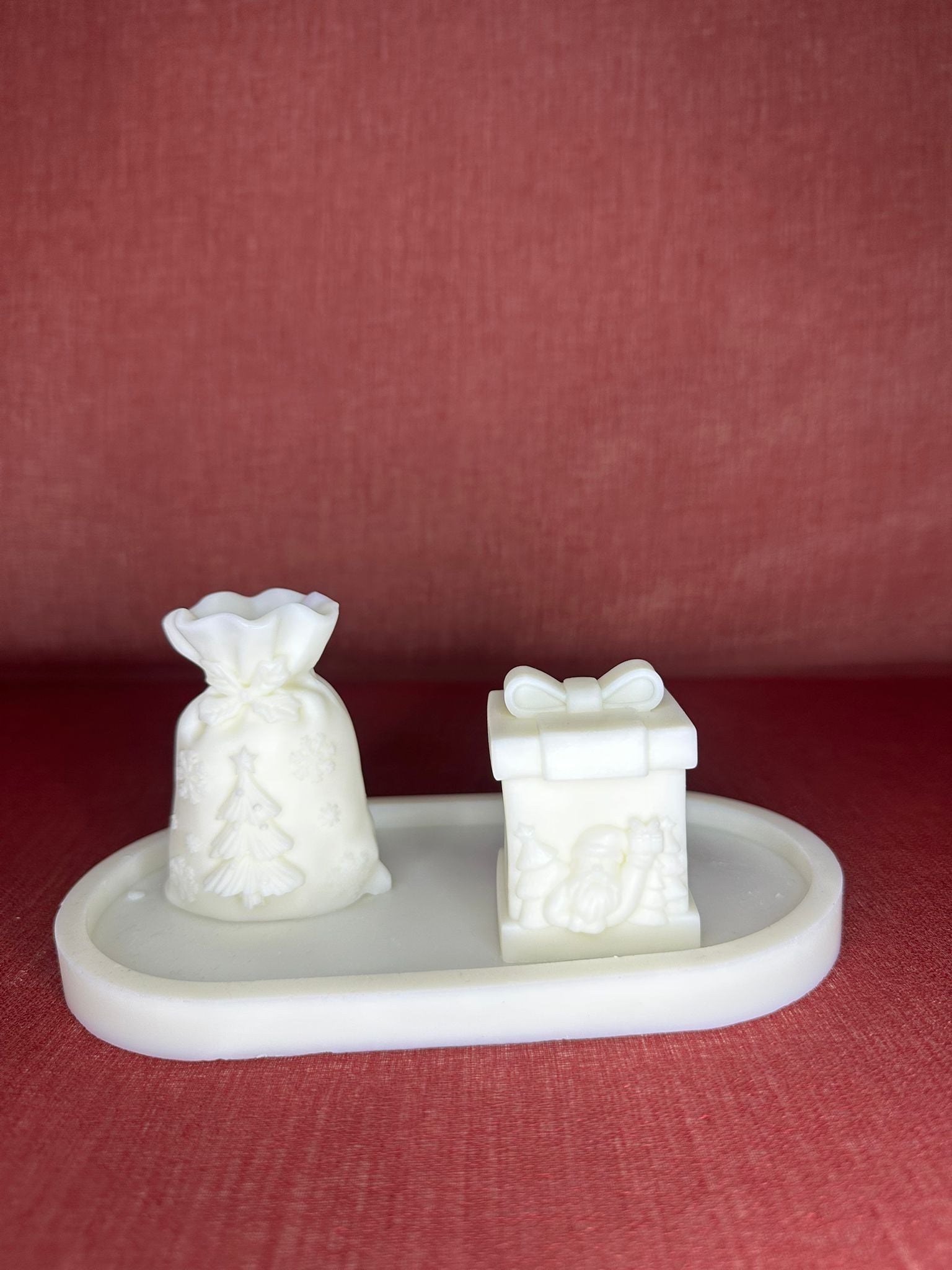 Aggiungi un tocco magico alle tue feste con questo elegante set di candele natalizie artigianali, realizzate al 100% in cera di soia. Il set Il Dono di Natale comprende due candele: una a forma di sacco regalo decorato con alberi di Natale e fiocchi di neve, e una a forma di pacco regalo con rilievi natalizi come Babbo Natale e decorazioni festive.