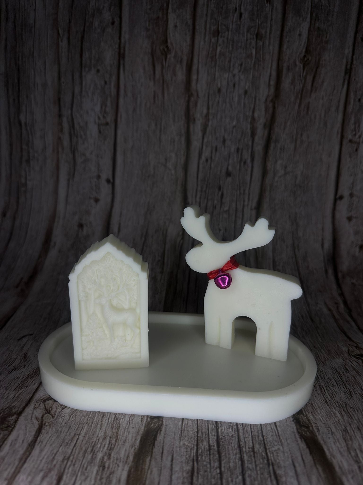 🦌 Una candela a forma di renna minimal con collare rosso e campanellino