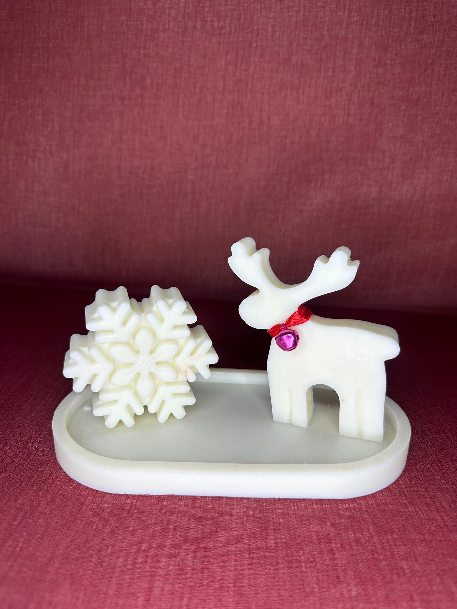 Scalda l’atmosfera delle feste con il set “Fiocco & Renna”, due candele artigianali in cera di soia naturale dal design incantevole. Il set include una candela a forma di fiocco di neve stilizzato e una renna nordica con collare in nastro rosso e campanellino, il tutto su una base coordinata.