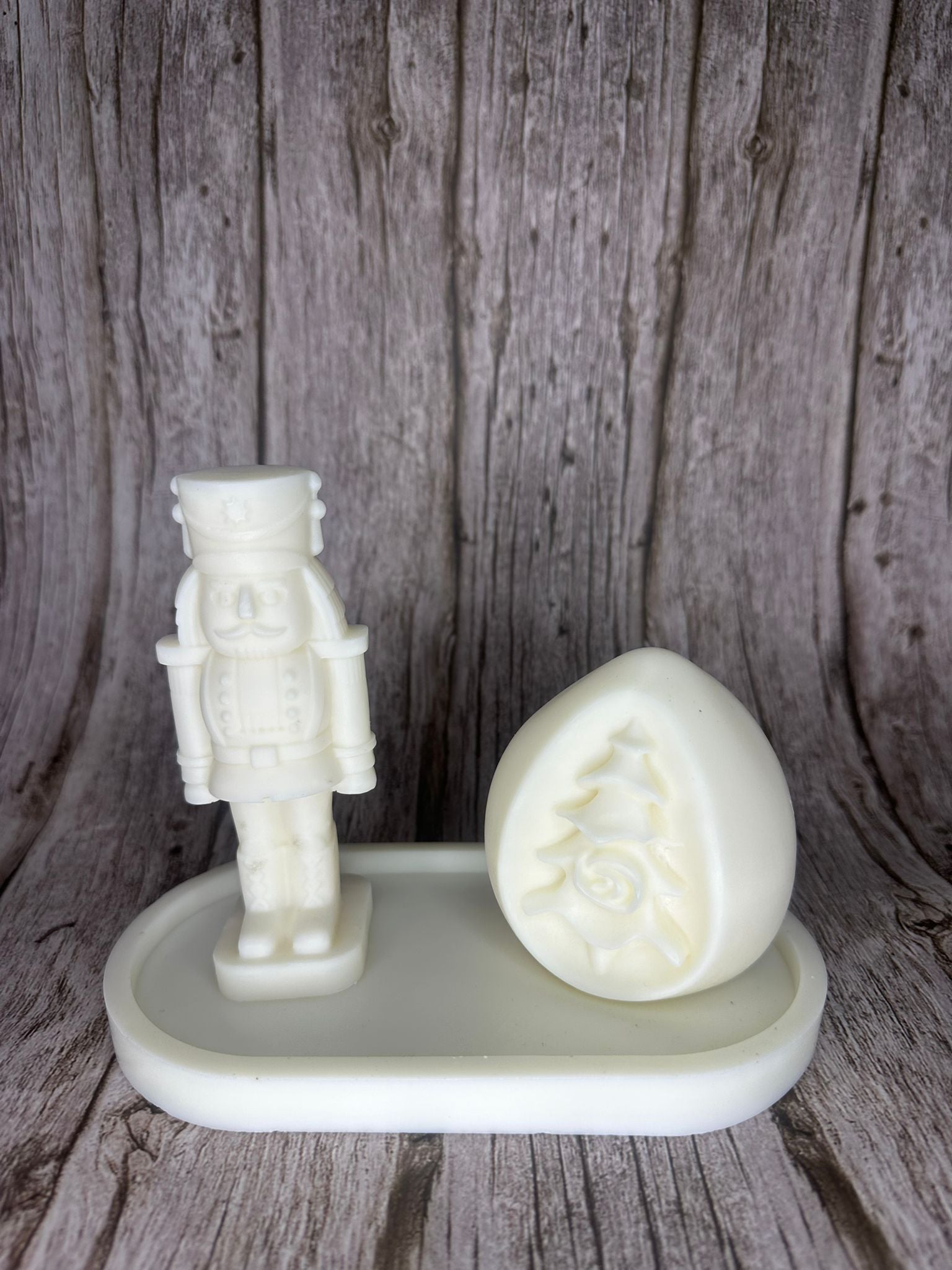 Composto da uno Schiaccianoci, simbolo di tradizione e protezione, e da una candela decorativa con rilievo ad albero di Natale, il tutto su base coordinata.
